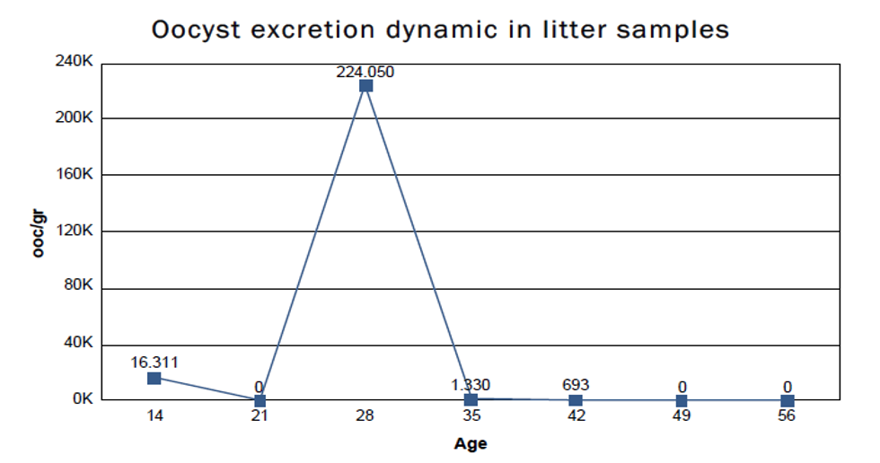 This graph presents data from another field case demonstrating robust vaccine replication, with noticeable peaks at 7 days (13,298 OPG), 14 days (41,544 OPG), and 21 days (22,597 OPG). The high OPG count at 14 days initially raised concerns about a potential coccidiosis outbreak. However, when vaccination protocols and litter management are optimized, environmental factors can promote strong vaccine replication, resulting in elevated OPG values. The subsequent decline in OPG at 21 days, rather than a continued increase, suggests minimal field pressure. Therefore, in this case, the observed counts are not a cause for alarm.